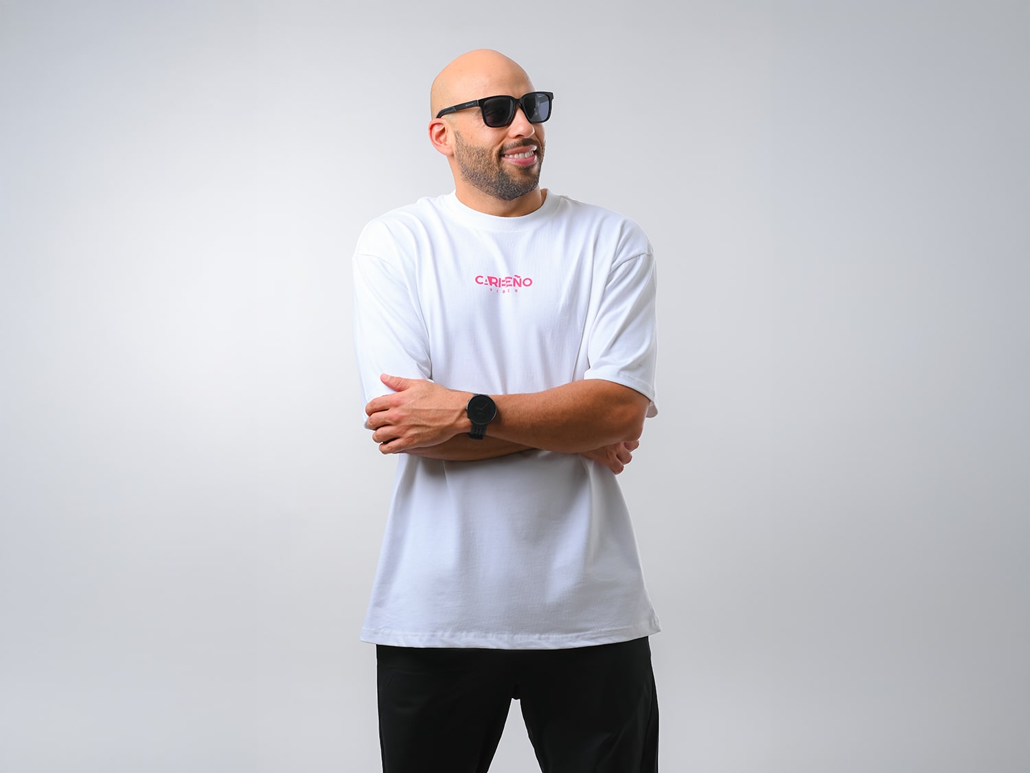 Nhìn vào bức ảnh đầu tiên, bạn có thể thấy rõ điều này. Người mẫu Tây với phong thái tự tin, mái đầu cạo trọc cùng cặp kính râm sành điệu đã biến chiếc áo thun trắng đơn giản thành một item thời trang đầy cá tính và cuốn hút. Anh ấy không chỉ mặc áo mà còn truyền tải một phong cách sống hiện đại, năng động, giúp chiếc áo thun trở nên “có hồn” và hấp dẫn hơn trong mắt người xem.